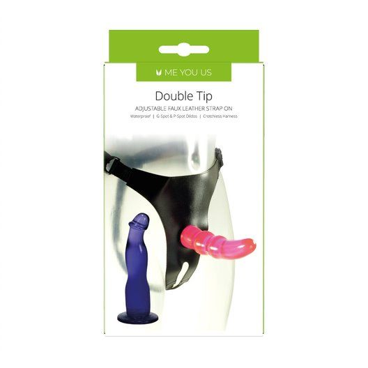 The Double Tip strap-on by Me You Us comes with 2 removable dildos for varied pleasure. It’s great for those of you that love to switch up pleasure and intensity and love to try something different when it comes to strap-on play. This strap-on kit features a crotchless harness and with a G-string - it’s adjustable to suit your body for a great fit. The first dildo is pink with a smooth curved tip and two bumps on the shaft for incredible stimulation. The second is purple and has a realistic penis head followed by a curvy shaft. This option of two dildos delivers G-spot and P-spot stimulation making it an ideal pick for unisex pleasure. The dildos measure 18cm and 18.5cm in length and the harness fits waist sizes from 61cm to 108cm. The harness can be used with most dildos. The dildos included here are free from phthalates and latex and are waterproof for bath and shower fun.